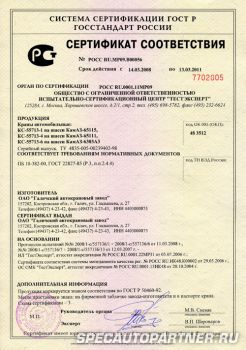 Одобрение типа транспортного средстваОдобрение типа транспортного средства №РОСС RU.MP03.E01000 Выдано Ассоциацией по безопасности машин и оборудования "ТЕСТ-СДМ" Действует до 31 декабря 2008 года Разрешение на применениеРазрешение на выпуск и применение № РРС01-000353 Выдано Федеральной службой по экологическому, техническому и атомному надзору Срок действия 24.04.2013 РазрешениеРазрешение №1977 Выдано Министерством по чрезвычайным ситуациям Республики Беларусь Дата выдачи 14 марта 2005 года | Смотрите также