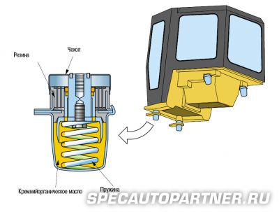 Новая кабина с демпфирующим элементом и ходовая часть В подвеске кабины бульдозера D275A-5 используются демпфирующие элементы новой конструкции, которые эффективно поглощают ударные нагрузки и вибрацию за счет значительной длины их рабочего хода. Демпфирующие узлы подвески кабины и новая ходовая часть, оснащенная Демпфирующий узел подвески кабины